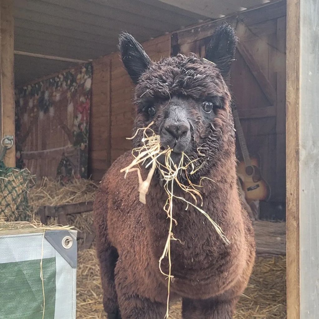 Prancer is the eldest child and the son of Friday. He is the friendliest of all our alpacas and loves the attention. His nickname is "Prancer the poser" because anytime a camera comes his way he poses- picture perfect! He is quite unlike our other alpacas and enjoys time alone, he loves his daytrips in the van visiting people all around Birmingham. He likes being indoors and is very curious